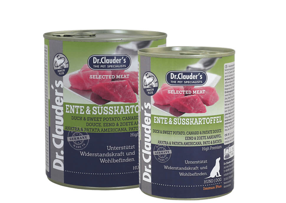 Zusammensetzung: 41,5% von der Ente (Muskelfleisch, Herz), 36% vom Schwein (Leber, Lunge), 16,3% vom Rind (Lunge, Euter), Süßkartoffeln 5%, Mineralstoffe 1%, Hefe-Beta Glucane 0,2%.