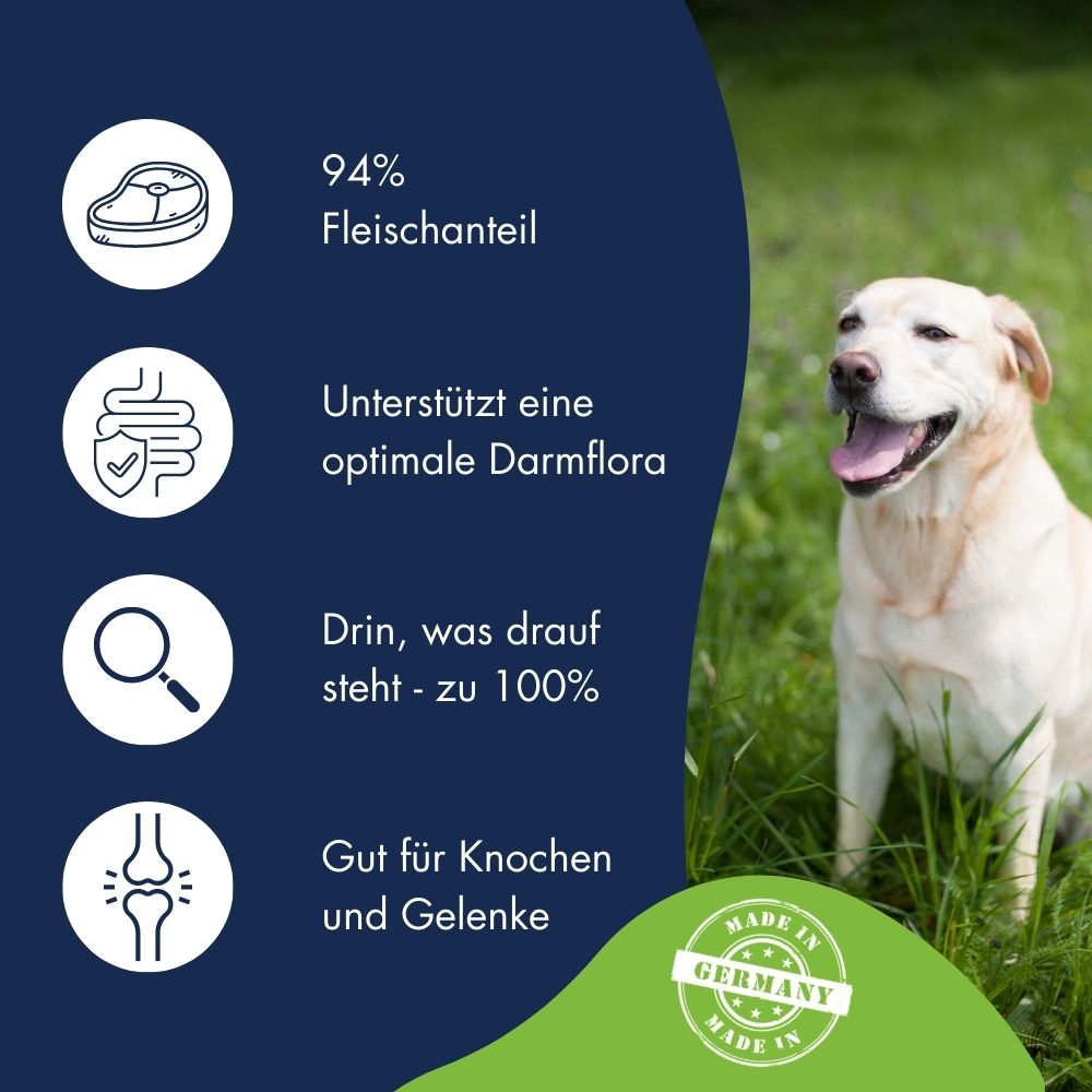 Zusammensetzung: 42,72% vom Lamm (Leber, Lunge), 25,64% vom Rind (Herz, Fleisch, Leber, Lunge), 25,64% vom Schwein (Herz, Fleisch, Leber, Lunge), 4% Apfel, 1% Mineralstoffe, 1% Inulin (FOS).