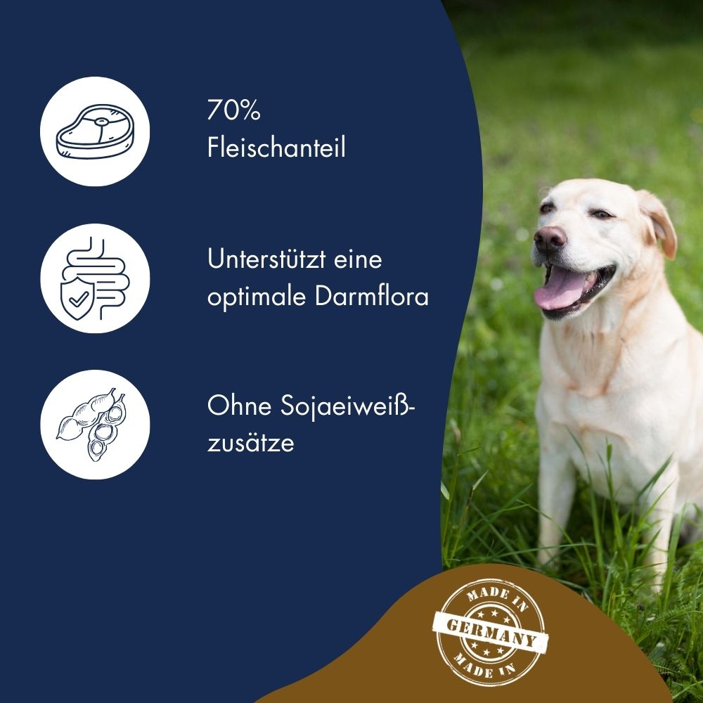 Zusammensetzung: vom Pferd 70% (Fleisch, Herz, Leber, Lunge), Mineralstoffe 1%.
