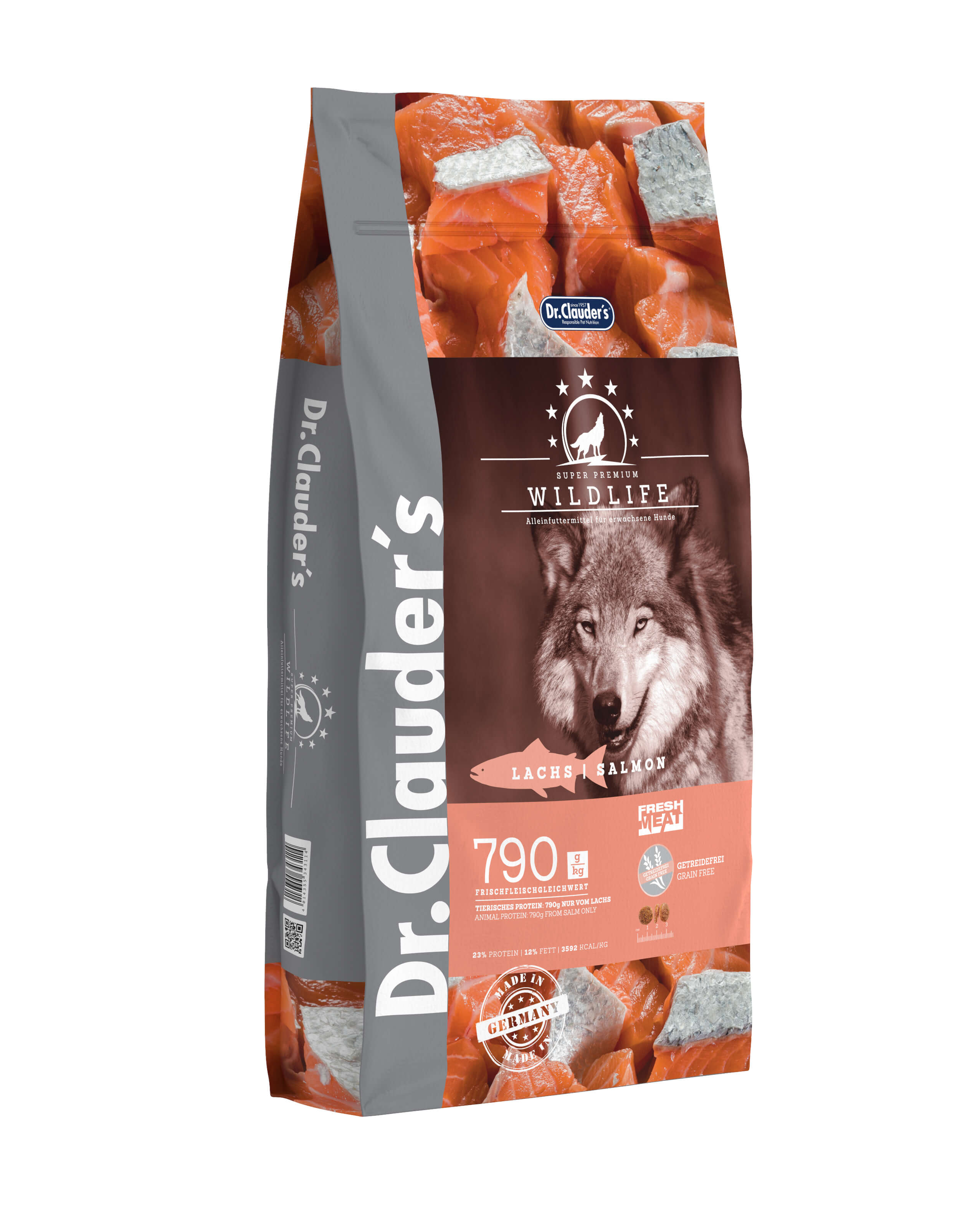 Zusammensetzung: Lachs 28%, Lachsmehl 17%, Kartoffelstärke, Süßkartoffeln (getrocknet), Rübentrockenschnitzel, Kartoffelmehl, Erbsen (getrocknet), Fischöl, vegetarisches Eiweißhydrolysat, Hefe-Beta Glucane, Chicoreepulver, Yucca-Schidigera-Pulver, Brennessel (getrocknet), Brombeerblätter (getrocknet), Schafgarbenkraut (getrocknet), Fenchel (getrocknet), Kümmel (getrocknet), Kamillenblüten (getrocknet), Mistelkraut (getrocknet), Enzianwurzel (getrocknet), Tausendgüldenkraut (getrocknet).
