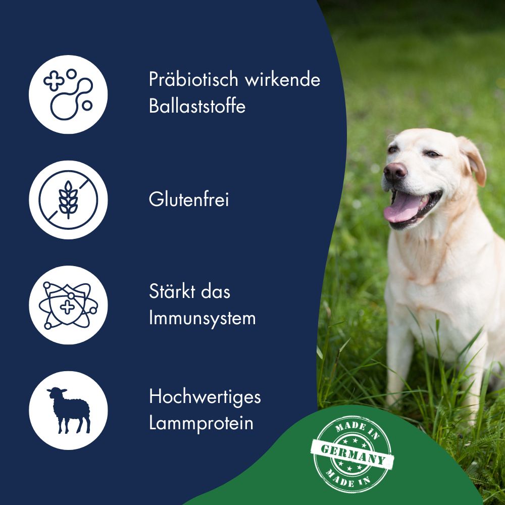 Zusammensetzung: Reis 49,5%, Lammprotein (getrocknet) 24%, Reisprotein, Rübentrockenschnitzel, Proteinhydrolysat 3%, Geflügelfett, Reiskleie, Leinsamen, Johannisbrotmehl, Chicoreepulver 1%, Natriumchlorid, Hefe (getrocknet, inkl. 0,05% Glucane), Kaliumchlorid, Mariendistel 0,1%, Grüner Tee (getrocknet) 0,1%.