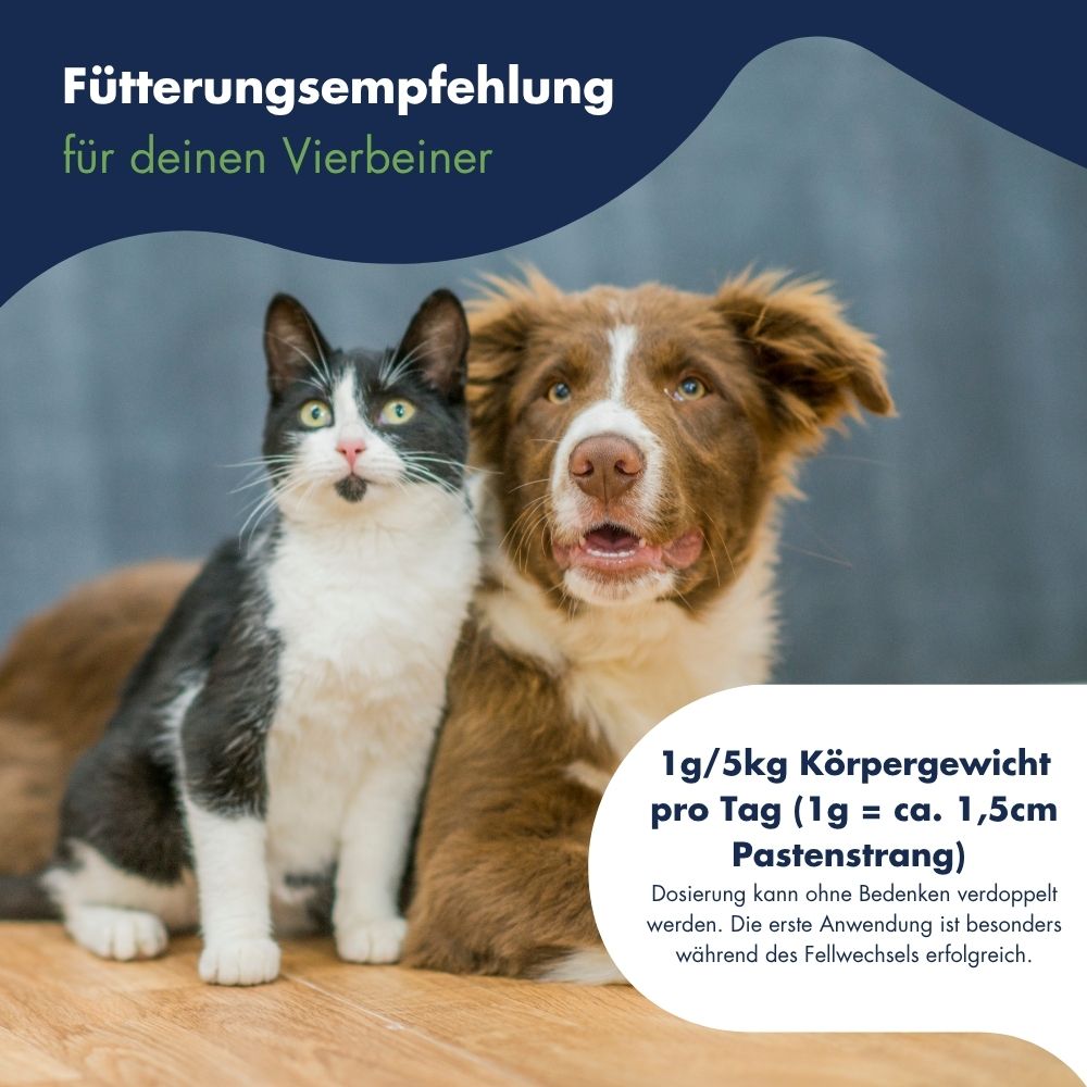 Feeding advice: 1g/5kg body weight per day (1g = approx. 1.5cm paste strand) Dosage can be doubled without doubt. The first application is particularly successful during the coat change.