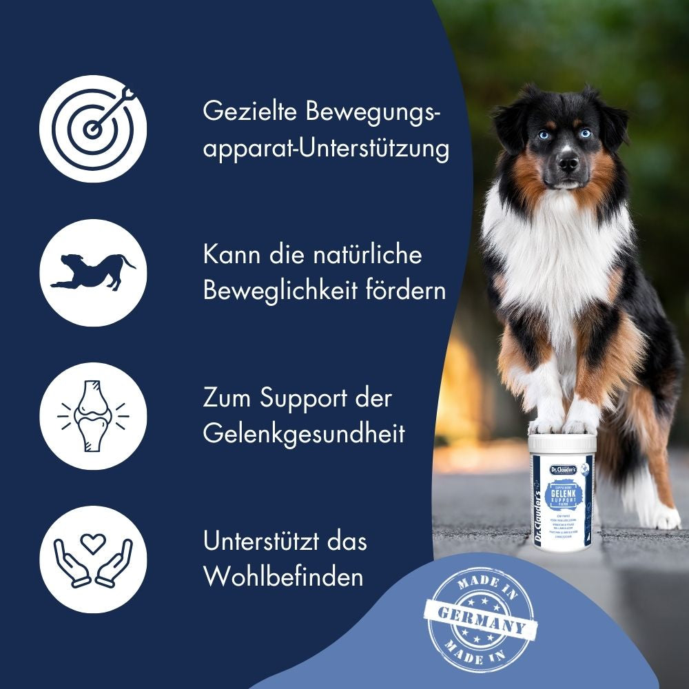 Ob im Wachstum, sportlich aktiv oder im besten Alter – die Gelenke unserer Hunde leisten täglich Schwerstarbeit. Mit dem Dr.Clauder’s Gelenk Support Pulver unterstützen Sie gezielt den gesamten Bewegungsapparat Ihres Vierbeiners. Mit einem hohen Anteil an Gelatinehydrolysat (43,5 %) und funktionalen Wirkstoffen wie Glucosamin, Chondroitin und Hyaluronsäure liefert das Pulver gezielte Unterstützung für Gelenkknorpel, Bänder und Sehnen. Hochwertige Proteine, Vitamine und Spurenelemente fördern zusätzlich Vitalität und Wohlbefinden.