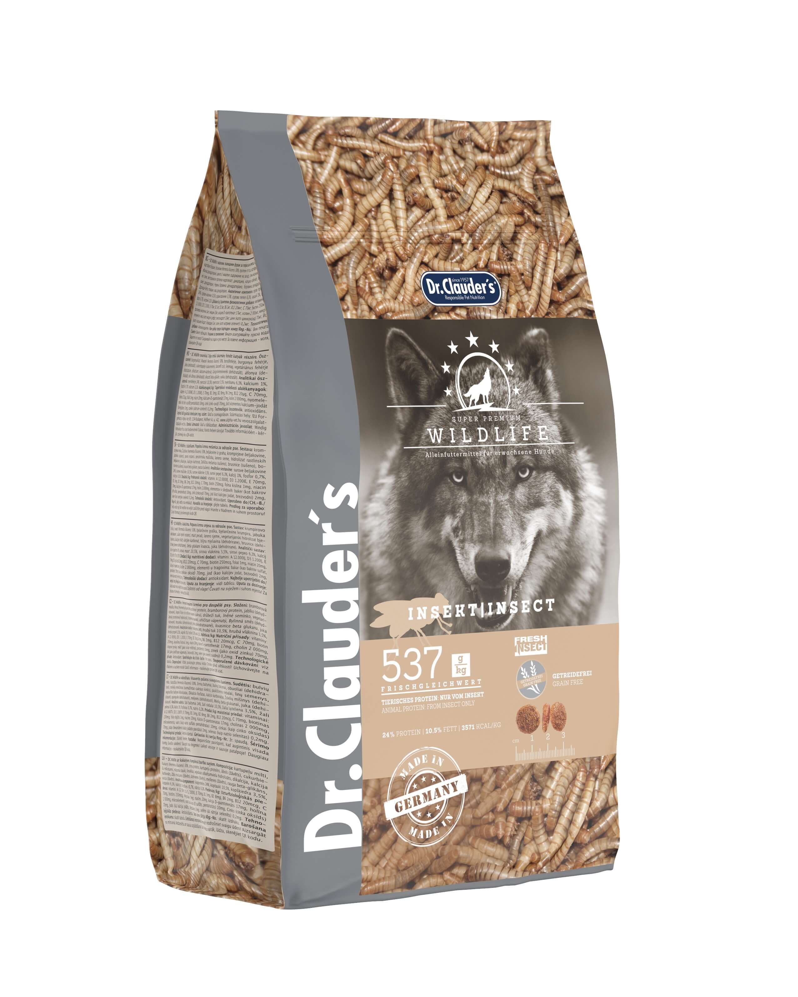 Zusammensetzung: Kartoffelmehl, Insekten (Hermetia illucens) 30%, Erbsenprotein, Kartoffelprotein, Apfel (getrocknet), Rübentrockenschnitzel, Geflügelfett, Leinsamen, vegetarisches Eiweißhydrolysat, Dicalciumphosphat, Calciumcarbonat, Kräutermischung (getrocknet), Preiselbeeren (getrocknet), Blaubeeren (getrocknet), Hefe-Beta Glucane, Yucca (getrocknet).