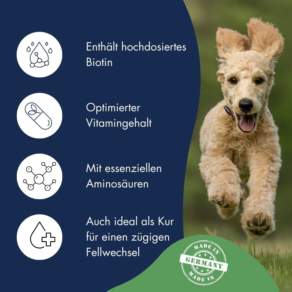 • Hochdosiertes Biotin für gesunde Haut und glänzendes Fell