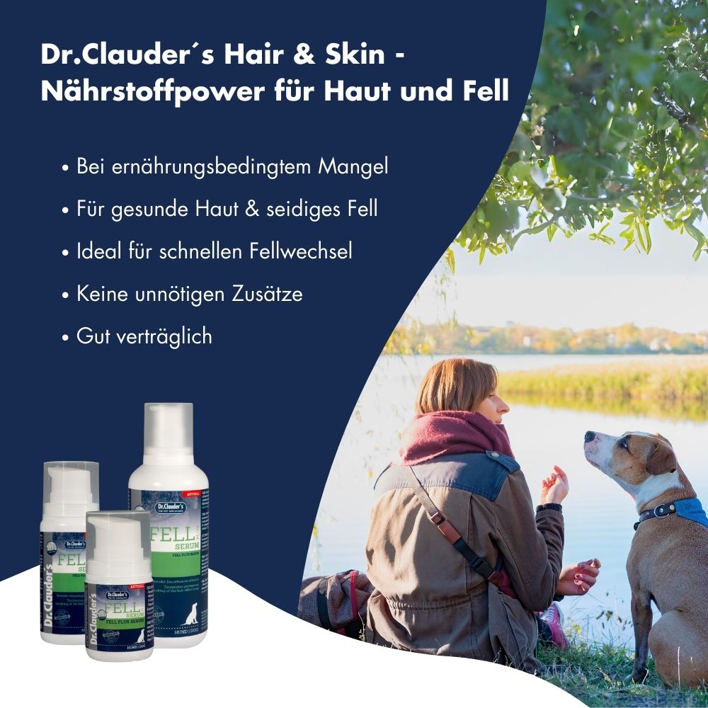 Bei ernährungsbedingten Mangelerscheinungen und zur Unterstützung von Hunden, die zu Dauerhaaren oder Haarbruch neigen, bietet Dr.Clauder´s Hair & Skin Fell Plus Serum 100ml eine effektive Lösung. Das Serum stärkt und schützt das Fell Ihres Hundes intensiv und fördert die Abstoßung des losen Althaares. Dr.Clauder´s Fell Plus Serum enthält hochdosiertes Biotin, optimierte Vitamingehalte und essentielle Aminosäuren wie DL-Methionin und Lysin sowie schnell verfügbare Energie aus Dextrose. Dieses Produkt ist langjährig erprobt und für alle Hunde geeignet, die unter Dauerhaaren oder Haarbruch leiden. Es ist auch ideal als Kur für einen zügigen Fellwechsel.